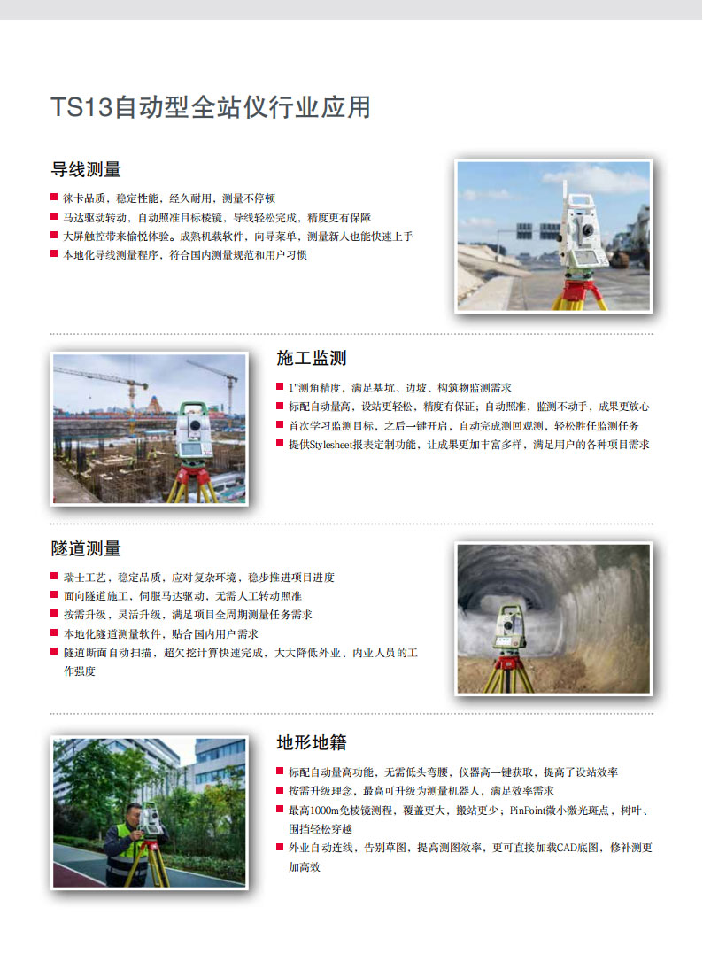 1”測(cè)角,1mm+1.5ppm測(cè)距,滿足測(cè)繪、施工全周期應(yīng)用需求,標(biāo)配自動(dòng)量高,愉悅測(cè)量體驗(yàn)徠卡測(cè)量全站儀產(chǎn)品擁有豐富的測(cè)量解決方案,經(jīng)過長期的積累,無論基礎(chǔ)測(cè)繪還是工程測(cè)量,或者是監(jiān)測(cè)檢測(cè),亦或是特種測(cè)量,我們都有合適的解決方案供您選擇。